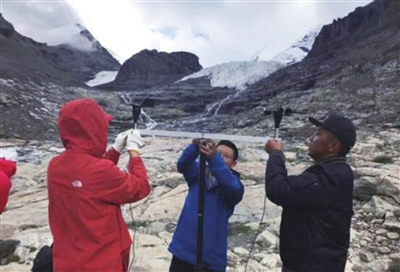 图为小分队在海拔5400米处的甲岗冰川脚下建自动观测站。