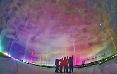除了国内,在加拿大、俄罗斯、美国、北欧等地也有光柱现身的报道,这都是大气中的冰晶和光源共同作用下的现象,有时候,这个光源可以是太阳,形成壮观的“日柱”景观。