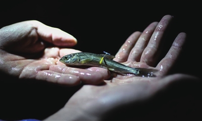 图为西藏藏木水电站繁育的拉萨裸裂尻鱼。