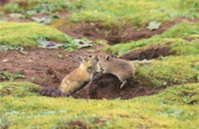 鼠兔的领地意识很强,不同家族之间的洞穴系统会有界限分割,但彼此之间又有重叠。夏季的清晨和黄昏,或者冬季的中午时分,鼠兔们纷纷出洞活动,场面一度非常混乱,毫无秩序可言。有的啃草,有的在洞口进进出出,有的窝在地上晒太阳,就像块石头,冷不丁翻过身来给人一记“惊吓”。时不常的,曲家鹏还能目睹一只鼠兔怒气冲冲地追着一个误入领地的“冒失鬼”,风一样地奔跑,直到把它轰走为止。那时候,为了捍卫主权,大打出手的情况也是有的。