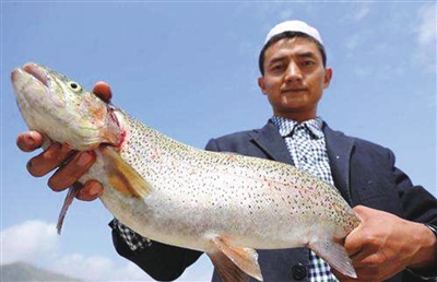 循化县红光村水产养殖基地,村民马文林在展示刚捕捞上来的三文鱼。 据新华社