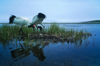 就在这对黑颈鹤跳舞的次日,它们高声鸣叫着,拍打翅膀,昂头挺胸,双双登陆上巢。它们的到来,让在这里已经定居多日的斑头雁、赤麻鸭、灰雁、须浮鸥全部退让。占领了这个人工巢后,这对黑颈鹤又来到水中央,载歌载舞,在荪草装饰巢面和巢壁新房里,步入婚姻殿堂。3天后,第一枚卵悄然落巢,孵卵、育雏正式拉开帷幕。一周后,另外两对黑颈鹤也像这对高调上巢的黑颈鹤一样,占领了另外的两个人工巢,开始了它们婚姻中的重要环节。