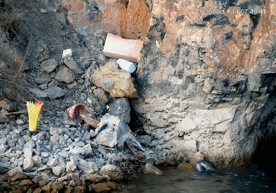 再如,顺河流而下堆积在岸边的垃圾。