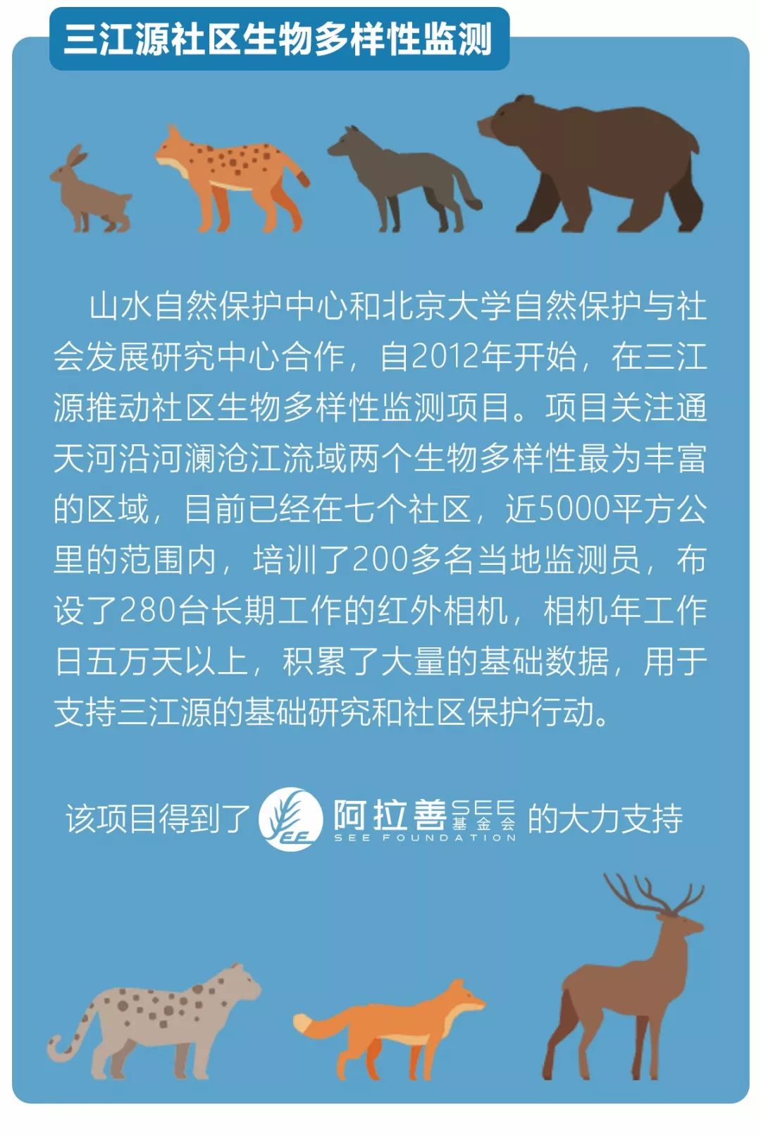 北大与山水的团队于2009年开始在玉树开展雪豹研究和保护工作,在毗邻可可西里的治多县索加乡,北京大学自然保护与社会发展研究中心的李娟师姐写完了三江源第一篇有关雪豹的博士论文。