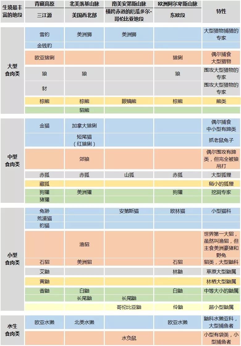 其中每一大类中颜色相同的行,代表的是各个生态系统中生态位类似的物种。比如雪豹和美洲狮都是生态系统中伏击壮年大型猎物的生态位;体型稍逊的欧亚猞猁占据伏击中型猎物的生态位;北美洲体型远小于欧亚猞猁的加拿大猞猁和短尾猫,只能和亚洲金猫一样占据主打小型猎物、偶尔捕猎中型猎物的生态位。