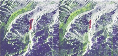 金乌措的SAR(合成孔径雷达)图像(左:溃决前;右:溃决后)