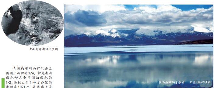 青藏高原的面积只占全国国土面积的1/4,但是湖泊面积却占全国湖泊面积的1/2,面积大于1平方公里的湖泊有1091个,是地球上海拔最高、数量最多、面积最大的湖群区。青藏高原由此获得“水乡”的美誉。大面积的湖泊不仅能改善青藏高原的生态环境,而且能延缓冰川的消亡。