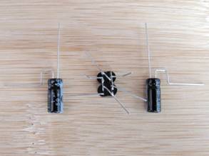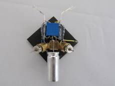 基座完成后,把3300μF储能电容的负极焊在基座中间的部分,注意负极引脚留出一段不要剪掉,用来连接控制用的电子部分。在两边卡箍里套进两只微型电机,电机轴向下。储能电容的顶部着地,与两只电机轴形成三点支撑。通过改变两只电机之间的夹角,可以微调机器人跑动的速度。而调整电容与电机夹角度,可以调节机器人的重心。这样机器人的基础结构部分就做好了。