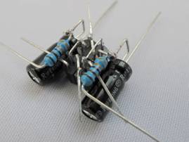完成“心脏”部分的制作后就要开始向外面焊接其他元件。把两只1μF电容的正极弯成如图所示的形状,分别与上方PNP管子向外展开的基极焊接在一起。然后把两只3.3kΩ电阻一端打个弯,套在1μF电容的正极上,另一端折成90°直角,向外展开。在两侧1μF电容的负极,各焊接上一只33kΩ电阻。电阻的另一端与3.3kΩ电阻的直角和NPN型管子向外展开的集电极焊接在一起。