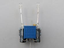 接下来焊接上两只单闪LED。LED负极焊接在多圈电位器两侧展开的管脚上,正极焊接在1μF电容的负极一端。把LED的引脚留出一定长度,为的是在总装以后弯折出一个艺术造型。