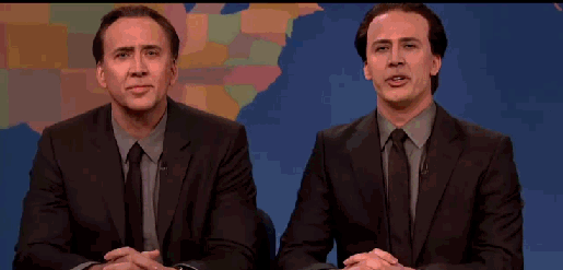 甚至在凯奇做客安迪·萨姆伯格(Andy Samberg)的《周六夜现场秀》中出现了两个一模一样的凯奇,还大方的玩起了自黑。