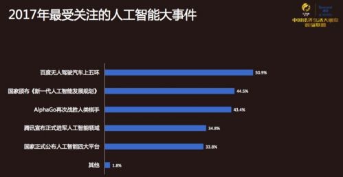 此外,调查显示,2017年最受关注人工智能事件中,“百度无人驾驶汽车上五环”、 “国家颁布《新一代人工智能发展规划》” 、“AlphaGo再次战胜人类棋手” 、“腾讯宣布正式进军人工智能领域” 、“国家正式公布人工智能四大平台”成为关注度前五的事件。