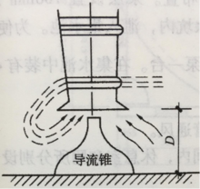 吸水口和集水池之间的距离应使吸水口和集水池底之间的过水断面积等于吸水喇叭口的面积。这个距离一般在D/2时最好(D为吸水口直径),增加到D时,泵效率反而下降。如果这一距离必须大于D,为了改善水力条件,在吸水口下应设一涡流防止壁(导流锥),并采用图2所示的吸水喇叭口。1