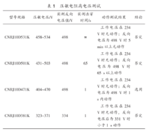 耐压值=线圈额定电压有效值×1.41(有效值转换为峰值的转换系数)×1.2(考虑 20%电源波动的余量系数)×1.2(压敏值的余量系数)。交流接触器线圈为 220 V 时,压敏电阻约为 470V。压敏电阻选择过小,灵敏度高、易损坏,过大则失去保护作用。首先确定抽油机控制器控制电路在线圈工作电压为 AC220 V,在工作范围内选择不同阈值的压敏电阻进行高电压测试(表 1)。根据表 1 中工作电压及动作时间选定 CNRJ10D471K型压敏电阻,在工作电压内保持高阻抗状态,从安全性上确保工作人员不会因电阻爆裂被炸伤,在电压升至电阻耐压值时导通泄压至接地端。