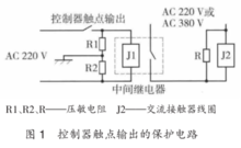 将压敏电阻分别接入电路启动停止线路,与接地端跨接(图 1)。同时可以兼顾启停电路火线、零线中电压变化,安全可靠,保证压敏电阻在反向电压过高时导通接地端进行分压。控制器触点输出、中间继电器和 J2 组成控制回路,控制设备切断和运行;压敏电阻和控制器接地在控制回路中组成保护电路,泄放中间继电器、J2 中的反向电压,排除对控制器的干扰。