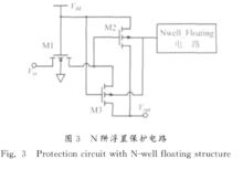 为了解决输出摆幅问题,提出一种 N阱浮置结构,其原理如图 3 所示。该结构采用 N 阱浮置电路为输出级PMOS管的衬底提供合理偏置,抑制寄生二极管的导通。当