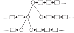 为描述方便,以下所说相等是指两个特征码对应的网页内容相同或相近,不等是指两个特征码对应的网页内容不同。当出现特征码相等的情况时,需要进行合并处理。算法采用扩展二叉排序树为主要的数据结构,在传统的二叉排序树的每个结点中增加一个指针,该指针指向由特征码构成的链表,称为“辅指针”。辅指针指向与该结点对应网页内容相近的网页特征码,这样就可以较方便地处理网页合并的情形。最终保留在检索结果集中的是扩展二叉排序树中各结点表示的特征码对应的网页。扩展二叉排序树结构如图3所示。