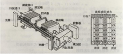 板框压滤机是最先应用于化工脱水的机械。虽然板框压滤机一般为间歇操作、基建设备投资较大、过滤能力也较低,但由于其具有过滤推动力大、滤饼的含固率高、滤液清澈、固体回收率高、调理药品消耗量少等优点,在一些小型污水厂仍被广泛应用。1