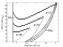 于每个给定βsr,在Ψ∈[0,3]的区间内变化转速,在此过程中记录下方程出现零实部特征根的参数点(分岔点)。方程的其它参数取为:Msr=0.2,ζr=0.05,ζs=0.05,βcr=20,D=0.0,μ=0.16。通过稳定性分析发现:出现转子交叉耦合阻尼项(即γr≠0)或定子交叉耦合刚度项(κs≠0)会使同频全周碰摩解的稳定区域缩小。而出现转子交叉耦合刚度项(即κr≠0)或定子交叉耦合阻尼项(即γs≠0)会使同频全周碰摩解的稳定区域增大。图1和图2分别给出了只出现转子交叉耦合刚度项(即κr≠0)和只出现定子交叉耦合阻尼项(即γs≠0)时,参数平面(Ψ,βsr)上全周同频碰摩解的稳定区域图,图1和图2中的SN曲线表示同频全周碰摩解的存在边界(鞍结分岔边界),曲线SNL的左边和SNR的右边均为无碰摩响应区域,图中圈点组成的曲线是同频全周碰摩解的稳定区域的分界线(Hopf分岔边界),对于给定的交叉耦合阻尼系数或刚度系数,两条圈点曲线所夹的(左下)区域为同频全周碰摩解的稳定区,稳定区域以外的同频全周碰摩解存在区域为同频全周碰摩解的非稳定区,在该区域内有碰摩力大的局部碰摩响应或破坏性的反向涡动失稳响应。