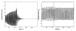 数值仿真结果如图3所示。可以看出:在施加控制力前,转子系统发生的是准周期局部碰摩,其碰摩力很大。在控制器工作后,系统响应由准周期局部碰摩运动快速过渡到同频全周碰摩的周期运动。可以看出:在施加控制力前,系统的碰摩力很大,严重的危害到转子系统的安全;在施加控制力后,碰摩力明显减小图3(上)。转子响应幅值也略有减小(见图3(下))。在控制过程中施加的控制力,一直维持在较低的水平。以上计算结果表明:对转子系统施加等效于产生交叉耦合刚度效应的控制力,能很好的抑制转子系统的碰摩力,减小碰摩带来的危害。这种控制力是施加在转子上,可以采用电磁轴承作为作动器。