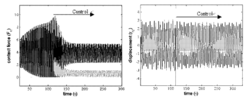在控制器工作前,系统响应为准周期局部碰摩运动,其幅值较大,碰摩力很大,严重地危害到转子系统的安全。在施加了控制力后,系统响应由准周期的局部碰摩过渡到准周期的全周碰摩运动,碰摩力明显减小,但仍在一定范围内波动(见图4(上)),转子响应幅值变化不大。从该控制过程施加的控制力看,其幅值明显大于前一种情况。以上计算表明:对转子系统的定子上施加具有交叉耦合阻尼效应的控制力能够起到减小碰摩力,减轻碰摩带来的危害的作用。这种控制力可以通过主动辅助轴承施加在定子上。