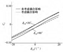 飞翼布局飞机舵面之间的交叉耦合主要在开裂式方向舵与相邻舵面之间。以左侧开裂式方向舵为例对交叉耦合的影响进行简要分析,对比考虑交叉耦合影响前后,开裂式方向舵与临近升降副翼产生的总操纵力矩系数。图6~图8为某状态点下,开裂式方向舵偏转20°和90°时,开裂式方向舵与临近升降副翼产生的总的滚转、俯仰和偏航操纵力矩系数。