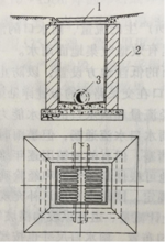 雨水口的构造包括进水箅、井筒和连接管三部分,如图1所示,图1中,1—进水箅,2—井简,3—连接管。雨水口的进水箅可用铸铁或钢铁混凝土、石料制成。采用钢筋混凝土或石料进水箅可节约钢材,但其进水能力远不如铸铁进水箅,有些城市为加强钢铁混凝土或石料进水箅的进水能力,把雨水口处的边沟底下降数厘米,但给交通造成不便,甚至可能引起交通事故。进水箅条的方向与进水能力也有很大关系,箅条与水流方向平行比垂直的进水效果好,因此有些地方将进水箅设计成纵横交错的形式,以便排泄路面上从不同方向流来的雨水。雨水口的井筒可用砖砌或用钢筋混凝土预制,也可采用顶制的混凝土管。雨水口宜设污染物截流设施,目的是减少由地表径流产生的非溶解性污染物进入受纳水体。合流制系统中的雨水口,为避免出现由污水产生的臭气外溢的现象,应采取设置水封或投加药剂等措施,防止臭气外溢。因此雨水口的深度一般不宜大于1m,并根据需要设置沉泥槽。遇特殊情况需要浅埋时,应采取加固措施。在有冻胀影响的地区,雨水口的深度可根据当地经验确定。雨水口的底部可根据需要做成有沉泥井或无沉泥井的形式,图2所示为有沉泥井的雨水口,它可截流雨水所挟带的砂砾,免使它们进入管道造成淤积。但沉泥井往往积水,孳生蚊蝇,散发臭气,影响环境卫生,因此需要经常清除,增加了养护工作量。因此,雨水口宜设污物截流设施。通常仅在路面较差、地面上积秽很多的街道或菜市场等地方,才考虑设置有沉泥井的雨水口。1