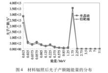 NTD 硅系统活化后产生较强的伽马放射性对堆厅产生较大的周围剂量当量,堆厅屏蔽层是作为单晶硅辐照转运辐射安全的重要防护措施。图 4 为材料辐照后出堆的光子产额。图4 可知:γ 能量主要分布在 1. 25 ~2. 25 MeV 之间。已知材料活化产生的 γ 能量分布可以估算堆厅及水池屏蔽层厚度。