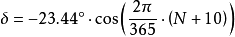 由于地球公转轨道的偏心率非常低,可以看作是一个圆圈,太阳赤纬可用下面两个公式来计算: