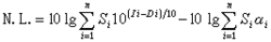 式中 N.L. 为透入室内的总噪声级(分贝);Si为围护结构第 i 块构件的面积(平方米);Li第 i 块构件外侧的噪声级(分贝);Di为第 i 块构件的隔声量(分贝);αi为第 i 块构件室内一侧的平均吸声系数。