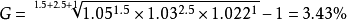 例:假定某地储蓄年利率(按复利计算):5%持续1.5年,3%持续2.5年,2.2%持续1年。求此5年内该地平均储蓄年利率。