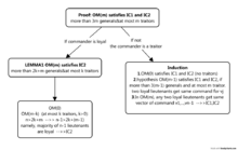 证明:当m=0 的时候,OM(0) 在将军是忠诚的时候满足IC2。当m>0 时,首先将军将命令传递给 n-1 个副官,然后每个副官对n-1 个将军执行OM(m-1) 算法。因为假设了n>2k+m(引理中有将军数大于2k+m),所以 n-1 > 2k+(m-1) >= 2k(即每一轮中副官总数不小于背叛者的两倍),这样每轮OM(m-k) 算法中忠诚的副官收到的命令都是majority(v1,v2,...,v(n-1)),其中忠诚副官发送的命令大于或者等于一半。