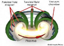 采用这种形状的反应堆称为 Tokamak。ITER Tokamak 将是一个独立式反应堆,其部件都装在不同的盒子中。进行维护时,工作人员可以方便地插入和拔出这些盒子,而不必拆开整个反应堆。该 Tokamak 的等离子体环形室将采用 2 米的内半径和 6.2 米的外半径。