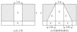 通过查阅相关资料可知:几乎所有立井的剖面均为一矩形,立井上下尺寸一致,切割井的截面或圆或方。立井爆破可提供的补偿空间有限,单纯增加切割井的直径无法有效利用切割巷提供的空间。若将立井剖面修改为上小下大的等腰梯形(楔形),不但可有效减小破碎岩石的夹制力,最大限度地利用切割巷提供的空间,而且可有效利用爆炸产生的爆轰气体协助完成爆破成井。不同形状的切割井如图1所示。
