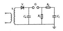 基本原理:冲击电压发生器的原理电路如图所示。主电容C0在被间隙C隔离状态下,由整流电源充到稳压电压U0。间隙G被点火击穿后,电容G0上的电荷经电阻Rt放电,同时也经Rt对C充电(此处,被测试品的电容可视为等值地并人电容Ct中),在被测试品上形成上升的电压波前。Ct上的电压被充到最大值后,反过来又与C0一起对Rt放电,在被测试品上形成下降的电压波尾。为了得到较高的效率,主电容C0应比Ct大得多,以便形成快速上升的波前和缓慢下降的波尾。