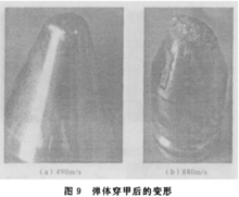 弹体穿甲后的典型变形和失效特征如图9所示。弹体在490m/s及以下的初始撞击速度下只发生轻微的变形,变形主要集中在弹体截顶与锥面的交界部拉,但没有正撞击时的对称性,弹体在880m/s初速撞击速度下发生了较大的破坏,发生部位在弹体的头部,而其它部位没有明显的变形。