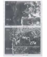 图5为镁蔷薇辉石陶瓷在SBF体液浸泡7d断面的形貌SEM和化学分析EDS谱图。从陶瓷断面可见明显的层状结构,EDS分析表明Ca、Mg、Si和P各元素存在规律的变化。由外到内先出现1~3μm厚的Ca和P层(类骨磷灰石,CHA),然后出现一层厚的富硅层,这种层状结构进一步证实陶瓷表面诱导类骨CHA的沉积。