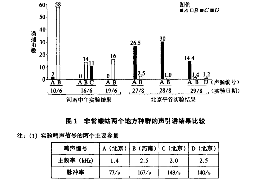 随着试验的进一步推进,问题出现了。研究人员发现,他们用北京平谷种群声诱捕最好的鸣声信号在河南中牟做声引诱的时候,发现引诱到的虫数很少。