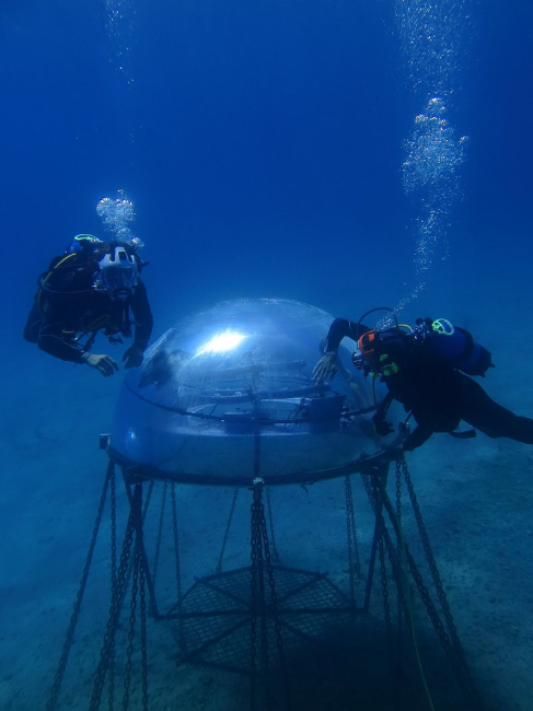 Fontanesi解释道:“采用正确的设计、保证温室的结构能够抵御风暴的来袭是最大的挑战。我们将有机玻璃与钢架结合在一起做出了个‘生物圈’。”这个半球体温室直径6英尺,高3英尺,并用28个可拆卸式的螺丝钉固定在海底。据Fontanesi表示,这种设计确保了温室在风暴来袭时的稳定性,使其能够承受一定范围内的振荡,并防止其被海浪撞击得支离破碎。