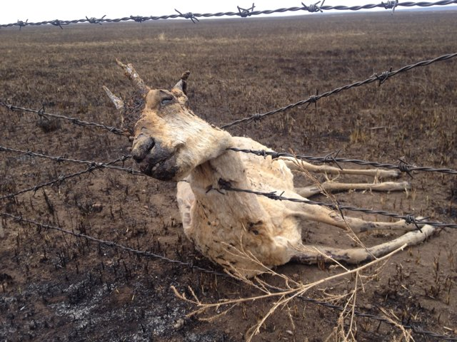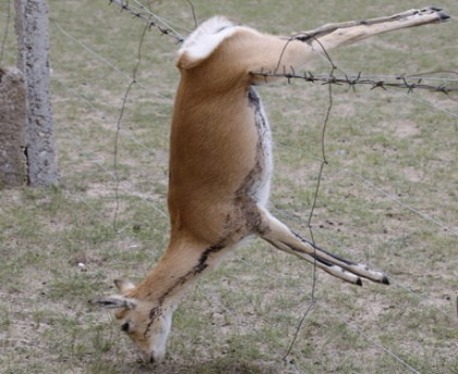 除了滥捕滥杀,另一个重要的因素就是在中蒙边境的围栏和牧民的家庭围栏。在中蒙边境线,中蒙两国以界桩为界,在各自距界桩500m架设1.5m高的铁丝网(所以铁丝网并不是边境),这是一道漫长的、与边界平行的铁丝网。1989年前,这个铁丝网还是起到了些保护作用(国内当时偷猎者甚多,限制入境也相当于保护了黄羊)。而在1998 年后, 这个铁丝网被移动到了50m的位置,而且还被加密、加固、加刺和增高到2m,黄羊难以越过,使得冬季进入我国的黄羊数量极少,能越过的也非死即残。
