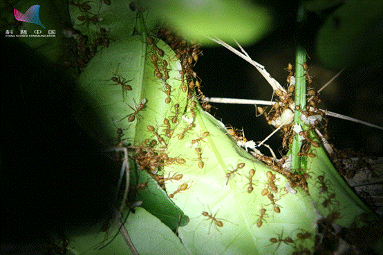2015年4月份,笔者进入海南岛陵水黎族自治县一个名叫大里的村庄进行野外考察,途中观察到了这样一幕:一群在树上生活的蚂蚁意外地掉进了溪流中,折断的树枝一半浸在水里。