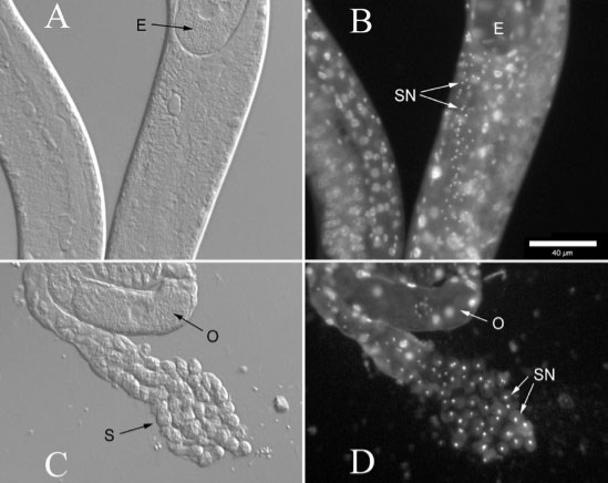 某种Panagrolaimus属内的线虫。该属线虫一般直径约50微米,图中的S代表精子,E为卵,O为卵母细胞。图片来源:参考文献2
