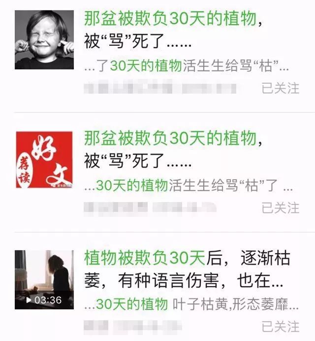 最近,朋友圈中出现了一条很热门的推送,标题大多是“那盆被欺负30天的植物,被骂死了……”。说的是两盆同样的植物,同样的环境条件,一盆对它赞美,另一盆对它辱骂,30天后,受到赞美的植物枝繁叶茂,而那个被骂的植物枯萎了。