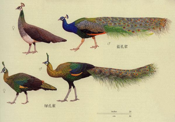 绿孔雀与蓝孔雀的体型对比。来源:世界鸟类手册(英文版)第二卷