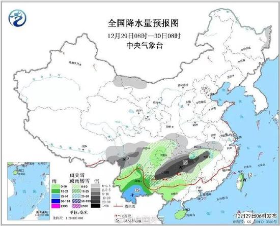 据中央气象台预报,江南等地将迎来大范围雨雪天气。30日,苏皖中南部、浙江北部、湖北东部、湖南中北部、江西北部、贵州南部和东部及内蒙古中西部、新疆西北部等地有小到中雪或雨夹雪,苏皖南部、浙江北部、江西北部等局地有大雪;福建北部、广西、云南中东部等地有小到中雨。31日至2019年1月1日,除华南南部有弱降雨外,全国大部降水稀少。
