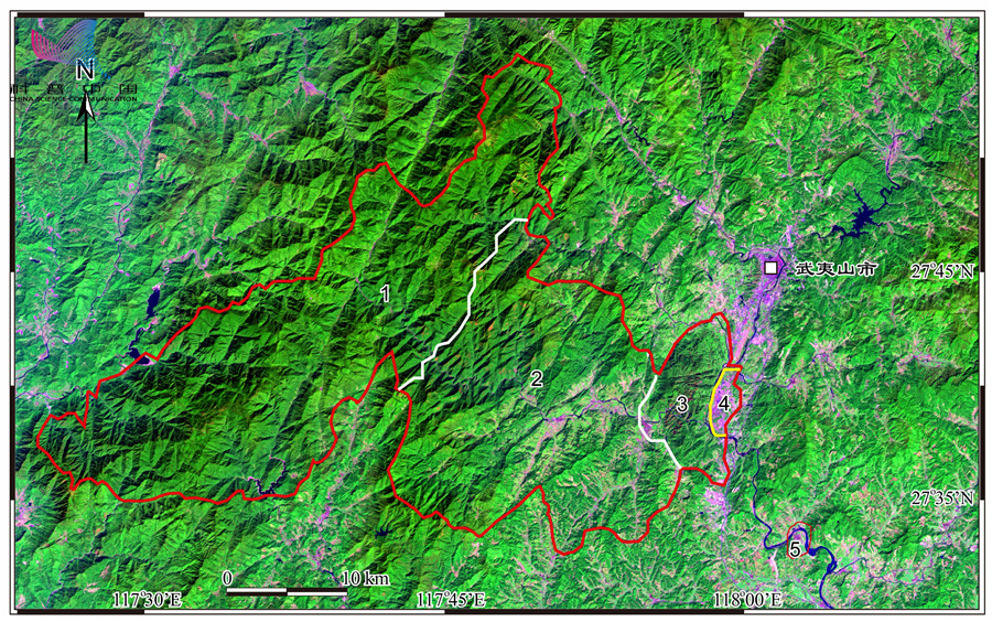 1.生物多样性保护区;2. 九曲溪上游保护区;3. 自然与文化景观保护区;4.旅游服务区;5.西汉闽越王遗址保护区。图像中绿色代表植被,粉红代表建城区不透水层,蓝色代表水体,红色代表裸露的岩石或人类活动区。