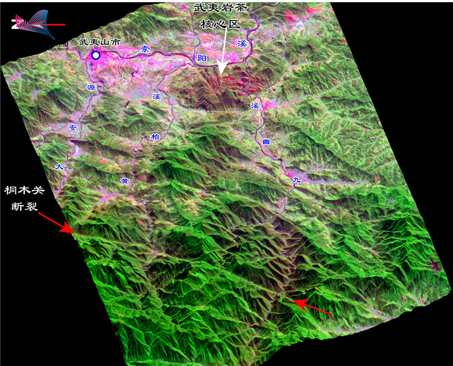 图3 高精度卫星遥感图像显示武夷正岩茶核心产区发育的近东西走向的巷谷和近南北走向的线谷地貌特征