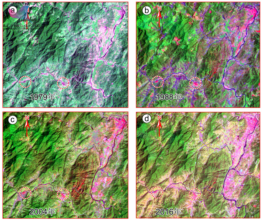 空间对地观测技术不仅可以为地球生态环境及其时空变化提供一种快速的监测和评估技术手段,还可以为区域绿色发展带来经济效益。多时相卫星遥感图像(图6)显示了武夷山九曲溪上游保护区近三十多年来生态环境的变化,特别是1987年武夷山加入联合国教科文组织人与生物圈计划,1999年12月被列入《世界文化与自然遗产名录》以来,其总体生态环境保护较好。但我们通过遥感图像分析也发现,沿九曲溪中游河谷地区居民聚集区规模在逐渐扩大(图6中红色圈定区域),其对武夷岩茶核心区生态环境的影响值得关注。