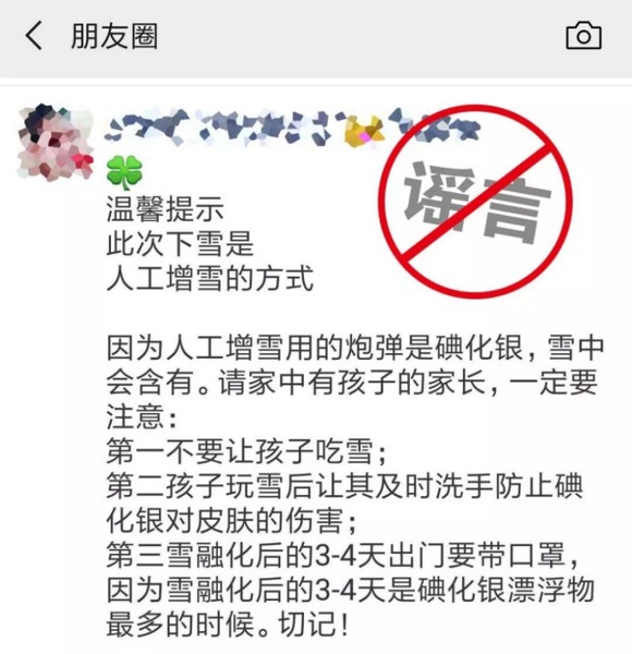 北方终于下雪啦!2月13日—14日,华北地区出现入冬以来范围最大、强度最强的一次降雪过程。这雪,下得挺给力,带来了美丽雪景和清新空气,滋润了北方干渴的冬小麦。 然而,就在人们的微信朋友圈被雪景照刷屏时,不少地方也流传着这样一个消息:这次下雪是人工增雪。人工增雪用的炮弹含碘化银,请大家注意不要让孩子吃雪;玩雪后及时洗手,防止碘化银对皮肤的伤害;雪融化后的三四天内碘化银漂浮物多,记得戴口罩……