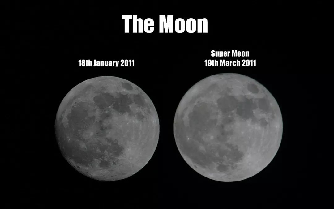 因此,满月发生时,如果月亮离地球越近(比如在近地点),人们看到的满月也就越大,比平时也显得更亮。一般情况下,发生在近地点时的满月(超级月亮,supermoon)要比发生在远地点时的满月(迷你月亮,micromoon)看上去大14%左右,变亮30%左右,比普通的满月也要亮6%左右。